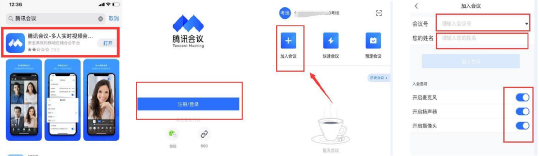 (1)请参加网考的考生考试前手机下载[腾讯会议]并注册登录,考试当天选择加入考试会议号。进入时用自己的名字(这里给大家强调以下,必须实名哦,考试过程中会有监考老师查看大家是否进入会议)亚老师会再考试前一天给大家发考试会议号。