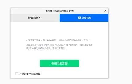 当使用PC进入会议时,系统会提示您选择音频接入方式,如下图所示: